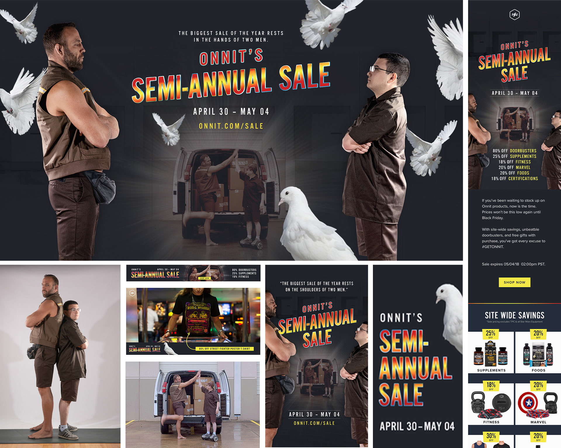 A spin-off theme of the "disgruntled delivery man". Two forces unite, brute strength and a sharp mind. I drew inspiration from movie posters like Last Action Hero, Demolition Man, and John Woo's white dove motif.